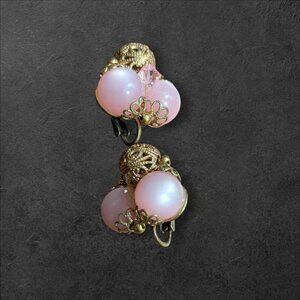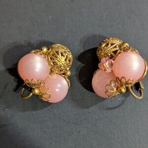 Vintage Pink Bead & Filigree Clip-On Earrings Costume Jewelry Retro Style