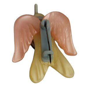 This beautiful bird pin is made of pink, blue, and yellow plastic. It measures 1.83 inches in length. The back has a metal and plastic C-Clasp designed to clasp easily to just about anything you wear.