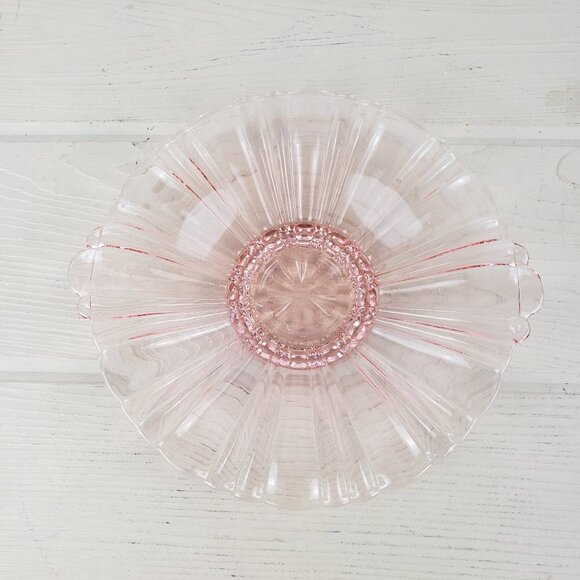 Vintage pink candy dish in excellent condition. There are some small bubbles in the glass but nothing very noticeable. The dish is 8" across.