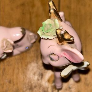 Charming pink ceramic deer figurines with gold accents. Missing some rhinestones but overall good condition. Vintage from the 1960s