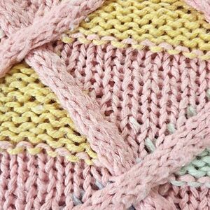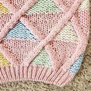 Hand Knit 80s Argyle pattern weaves pink with white, yellow, mint green, and robins egg blue / pearl button on the back collar / made in Korea