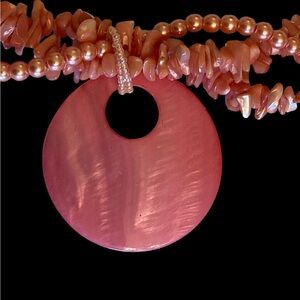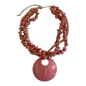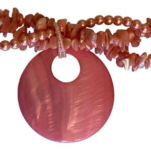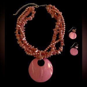 Beautiful Vintage Gently Pre-Owned Multi Strand Coral Pink Chip and Beaded Statement Necklace with attached Pendant and Matching Pierced Dangle Earrings