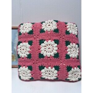 Vintage Pink Crocheted Granny Square Handmade Throw Pillow Cottage Core 15x15.