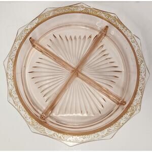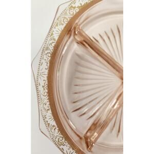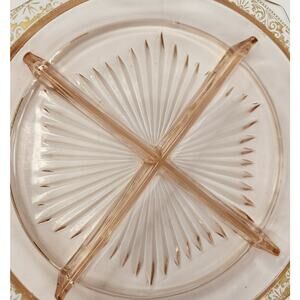 Vintage pink depression glass tray with four divided sections, gold scroll rim, and a radiant sunburst design. Measures approx. 1.5" H x 9" diameter. Some visible wear to the gold trim from age. A beautiful and functional piece of vintage glassware. Check out our store for other vintage glass pieces!