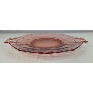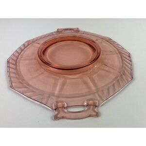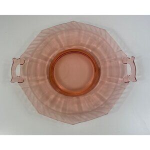 This vintage pink depression glass serving tray showcases an octagonal design with elegant etched patterns. Its dual handles add charm for serving or display.
