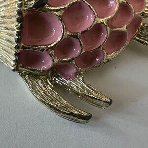 Add a splash of color and charm to your collection with this delightful vintage enamel fish brooch. Featuring gold-tone metal with flowing fins and vibrant pink enamel scales, this whimsical piece is a standout accessory for lovers of unique costume jewelry.