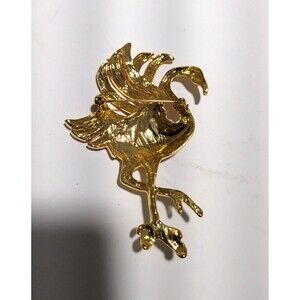 2.5 inch tall, gold tone flamingo brooch with pink enamel and clear rhinestones. This beautiful pin is in very good used condition with minimal wear.