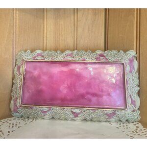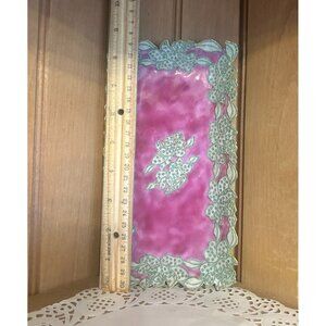 Vintage Pink Enamel Rectangular Cloisonne Decorative Tray Gold Accents Floral Edges
