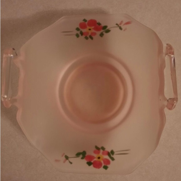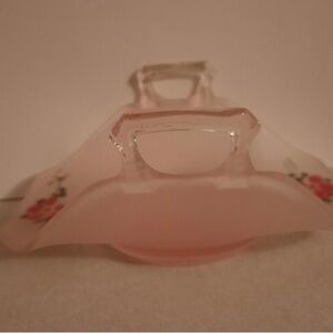 Elegant pink glass bowl with floral design. Perfect for decor or serving.