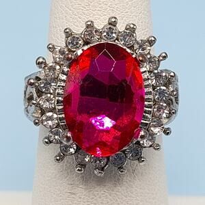 This ring features a beautiful pink glass stone, clear rhinestones, and a silver-tone band.