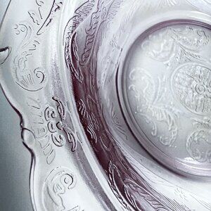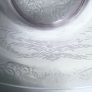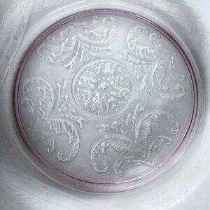 Elegant etched glass bowl with floral details, perfect for serving or as a decorative centerpiece. Its light pink hue adds a vintage charm.