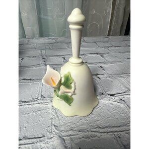 This vintage bell is a beautiful addition to any collection. The pink and green calla lily design is hand-painted on a porcelain ceramic material. The bell shape and floral pattern make it a perfect decorative piece for any room. It is 5 inches tall and comes unboxed.