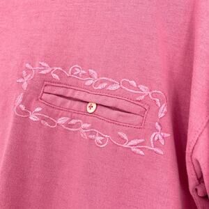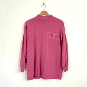 vintage embroidered top, 90s loungewear, pink long sleeve tee, mock neck shirt, floral embroidered sweatshirt, y2k softwear, nostalgic cozy top, pastel vintage shirt, relaxed fit pullover, pink cottagecore shirt, feminine vintage basic, retro casualwear, embroidered floral detail, soft knit layering top, cute vintage essential
