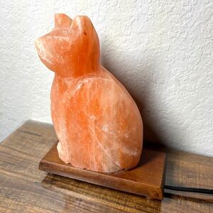 Carved Himalayan salt lamp in the shape of a sitting cat. When lit, it gives off
