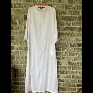 Vintage embroidered with flowers and embellished with lace around neckline dressing house coat robe in a size small. Ties at the neck. Two pockets that are slanted and hidden. Buttons down the front. Armpit to armpit Measures 18”. Shoulder to hemline measures 54”. Sleeve length 18”. 65% kodel polyester 35% cotton. Machine wash warm.