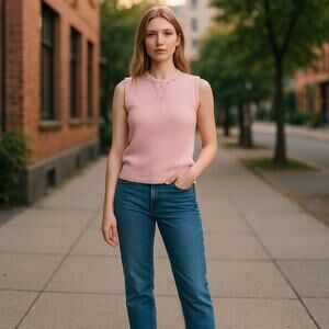 This exquisite vintage pink sleeveless sweater features stunning hand-embellished detailing at the neckline with clear rhinestones and delicate beadwork in a graceful swirling pattern. Crafted from a soft, lightweight knit in a feminine baby pink shade, this top offers both classic charm and elegant sophistication. The fitted silhouette with a crew neckline and ribbed trim at the armholes and hem creates a flattering, timeless look.
