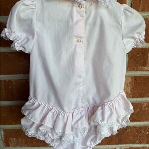 Charming light pink baby outfit with delicate lace details. Size 6 months