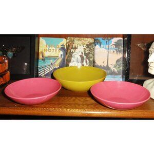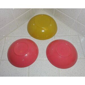Condition: Great! One pink bowl has a white scuff mark on the outer side. Bowls have very minor scratches from utensils. Please see all photos. These small flaws are not super noticeable and they do not take away the beauty and integrity of this unique vintage item.