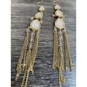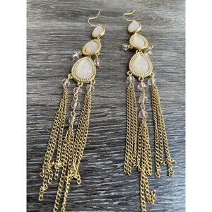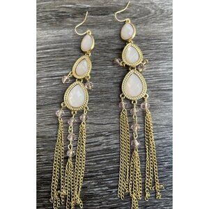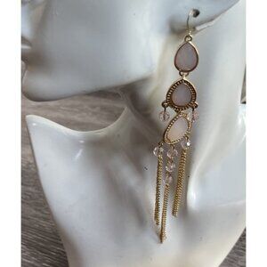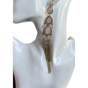 Vintage Pink Nude Glass Moonstone Tassel Layer Gold Earrings Dangle Chain 7”