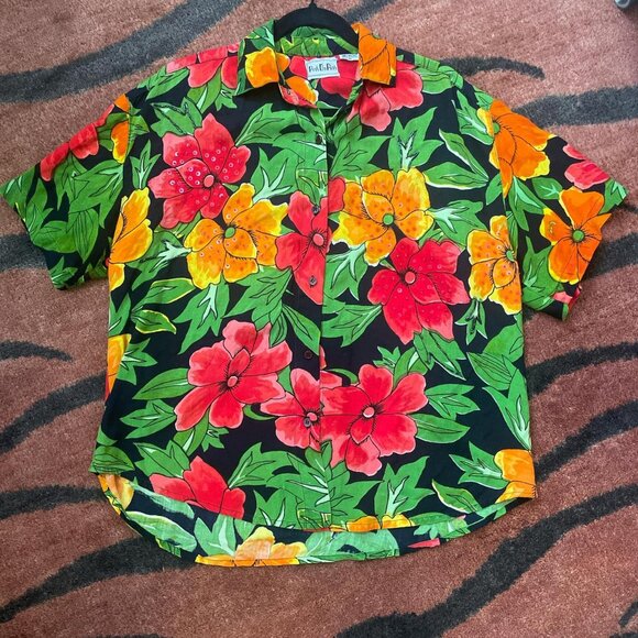 Vintage Vacation/ Summer Flowers with Sequins Button-up Shirt Size Medium