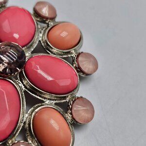 This brooch features an elegant combination of pink and peach stones set in a vintage-style design. The rhinestone center adds a touch of sparkle, making it a sophisticated accessory for enhancing any ensemble. Its intricate design and vibrant hues make it a standout piece for those who appreciate classic elegance.