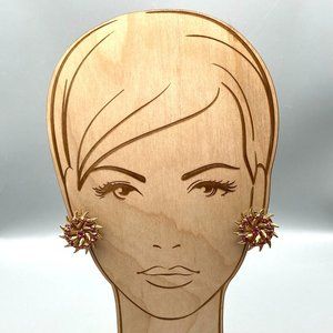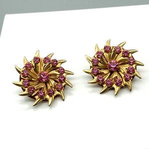Vintage Pink Pinwheel Statement Earrings, Bold Gold Tone Clip Ons with Chaton