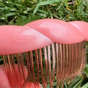 Vintage Plastic Hair Comb. Made in USA. Pink shimmer color with a chunky twist design. Approx 3 1/4” wide.