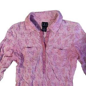 Vintage Pink Quarter Sleeve Collared Top Size Medium. Very Y2K INC International Concepts top in fabulous gently used condition. 69% Nylon, 29% polyester, 2% spandex. Floral pink print with snap closure.