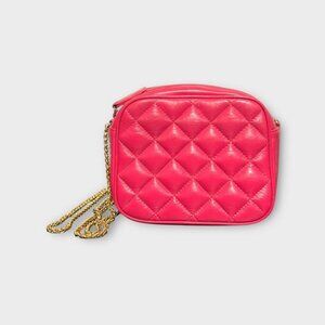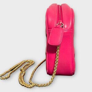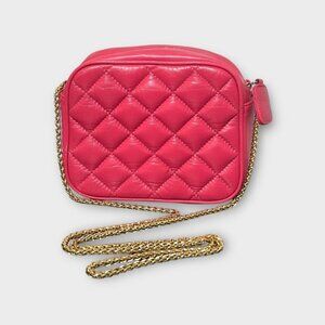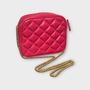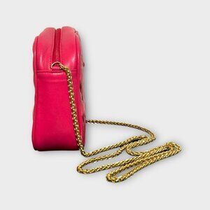 Get those classic Chanel vibes going with this beautiful vintage pink leather crossbody bag featuring a quilted stitched exterior and delicate braided gold crossbody chain.
