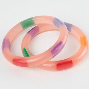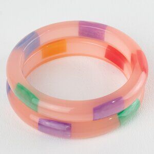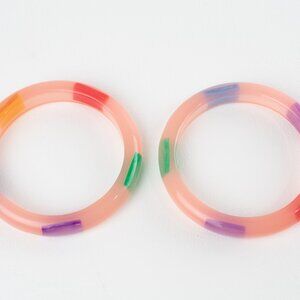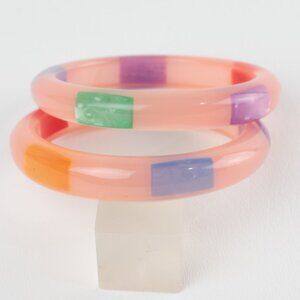Vintage chunky resin bracelet bangle, set of 2 pieces. Domed shape in translucent pink color with colorful moon-glow inclusions. Beautiful aspect. Excellent vintage condition.