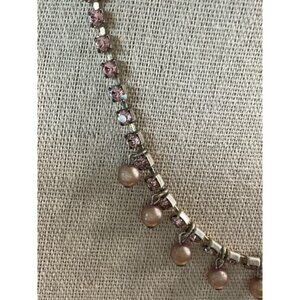 This exquisite vintage necklace features a silver-tone chain adorned with delicate pink rhinestones and faux pearls. The design exudes a classic charm, making it a timeless accessory for elevating elegant outfits. Its adjustable lobster clasp ensures a comfortable and secure fit, while the intricate details add sophistication to its vintage appeal.