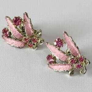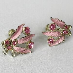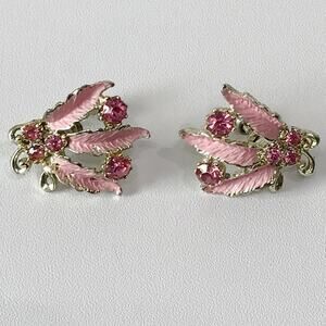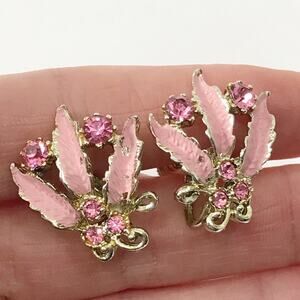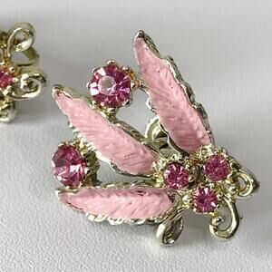 Vintage Pink Rhinestone Floral Flower Gold Tone Screw Back Earrings