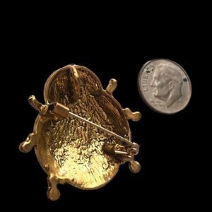 The brooch is just over 1.25-inches long & has neon teal accents.