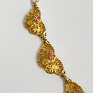 Vintage Pink Rhinestone Necklace 60s Gold Tone Chain Butterfly Floral Flower 24”