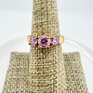 Step back in time with this elegant vintage ring. Featuring three sparkling pink rhinestones set in a classic gold-plated setting, this piece exudes sophistication & timeless glamour. The delicate design & feminine color make it a perfect addition to any jewelry collection, whether it's for yourself or as a gift for someone special.