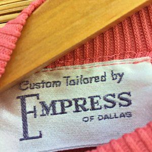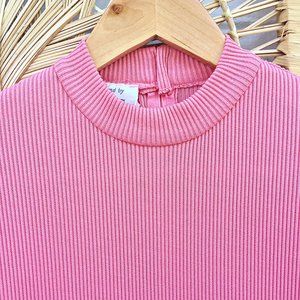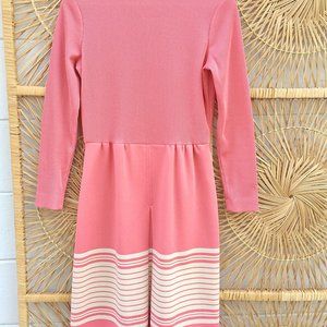 Sweet vintage dress in a stretchy ribbed pink fabric. Mock turtle neck with a zipper closure in back. Long sleeves. Excellent vintage condition. No size tag. Please see measurements and reach out with any questions.