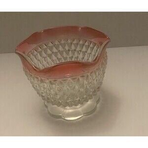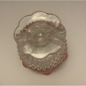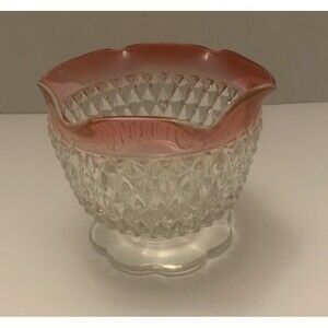 This beautiful vintage bowl set features a pink rim and a scalloped edge, perfect for adding a touch of elegance to your home decor. The glass material is of high quality and the production technique is cut glass, making each piece unique. The set includes a dessert bowl and a bowl, both standing on a pedestal compote dish.