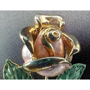Bring timeless romance to your outfit or collection with this vintage pink rose brooch, crafted with shimmering gold-tone petals and soft green enameled leaves. A lovely accessory for spring fashion, floral lovers, or as a meaningful gift symbolizing love and admiration.