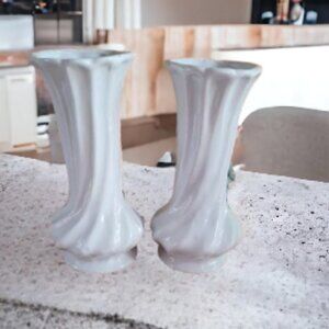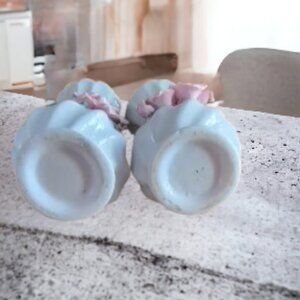 Very pretty Vintage flower vases in on white with pink rose flowers. The vases are 6 inches in height and 3 inches at the base. Very delicate and perfect for a small flower display. For the collector, nice for your vase display. Or use to place on table to show off .