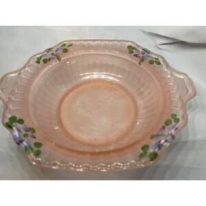 Vintage Pink Satin Glass Bowl has handles with Hand Painting of purple flowers and green leaves. This piece is in the Mayfair -Open Rose pattern and is in excellent vintage condition with no chips, cracks or scratches. Bowl measures 7” across x 8.25” handle to handle.