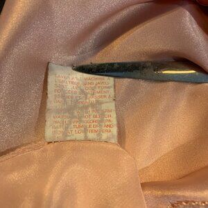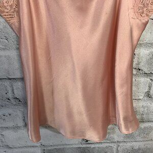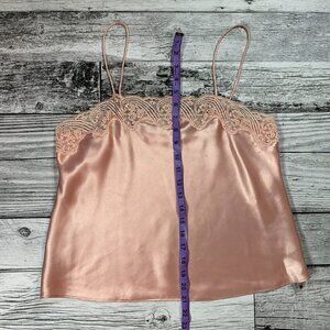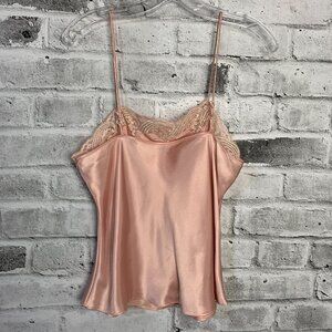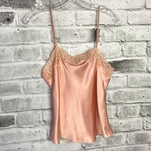 Step back in time with this vintage salmon liquid pink camisole top featuring a square neckline and strappy sleeves. The delicate lace trim with floral accents and satin fabric adds a touch of elegance, perfect for any occasion from casual to formal. The pullover closure and easy care make it a breeze to wear and maintain. This lightweight top is perfect for all seasons and fits a regular size 38 M/L. The bohemian and retro style of this camisole top is perfect for anyone who loves the 90s fashion. The adjustable spaghetti straps and sheer lace material add a touch of femininity, while the hippie and fairy character brings out the inner princess. This top is machine washable and made of polyester and nylon materials. Get ready to turn heads with this stunning vintage camisole top!