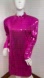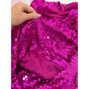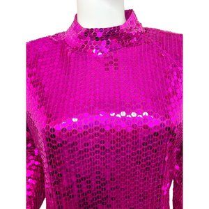 0903A- Vintage Spectacular Bold Bright pink Mirror Shine Sequins sheath dress L, knee length, sheath mock neck, cut out open scoop back, Full coverage front. Shoulder pads. Lined, Polyester/Spandex. Stretches. 10.5” zip back & hook & eye closure. 2” mock neck with double hook & eye closure. 39” armpits, 34” waist. 38.5” hips, 39.5” hemline. 38” long. Arms: 22”, 8” wrist opening. Does not have any inside tags for fabric or care information. Gently preowned. Excellent condition.