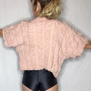 No tags or fixtures, just a cute basic layer piece in a soft, blush pink. Boxy cut but the drape of the fabric makes it so versatile. Super size flexible, I love it over black for festival and party outfits. Also great with lighter neutrals and pinks for a monochrome or femme look.