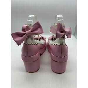 Vintage Pink White Scallop Bow hook eye Buckle Chunky Heel Mary Janes 23.5 US 7