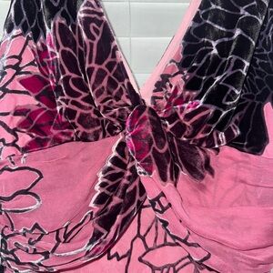 Elegant pink top with black velvet floral patterns. Perfect for any occasion. 14 inches pit to pit and 24 inches length.