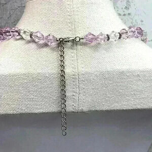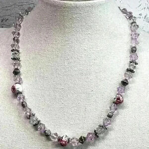 Vintage Pink and Clear Necklace with Silver Details and Rose Painted White Beads