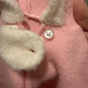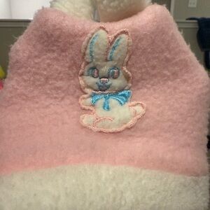 From the 80’s not sure where it’s from my mom used it for me when I was a baby in 1984 . Adorable pink and cream fleece featuring a cute bunny patch with a blue bow.