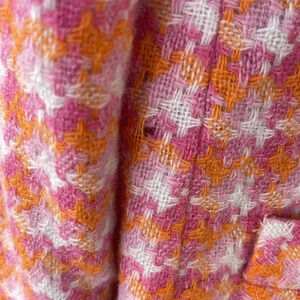 This fun and bright blazer is super comfortable and I really love the slightly cropped sleeves. The lining is in excellent condition. I can find two small holes and some wear under the sleeves. I’m guessing this is from Europe given the size tag says 44.