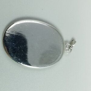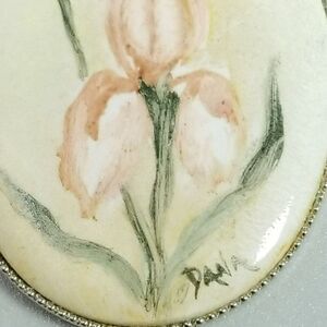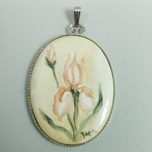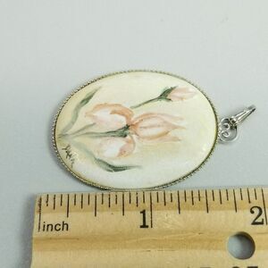 Vintage Pink and Green Painted Flower Pendant, Oval Silver Tone Setting, Signed