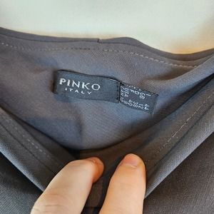 Understated minimal vintage dress from powerhouse Italian designer brand Pinko. Charcoal gray color, Cowl neck, sleeveless, slip on style with some stretch. Darting on front of dress to accent waist. Midi length. Lovely, simple dress for any number of formal occasions or work occasions.